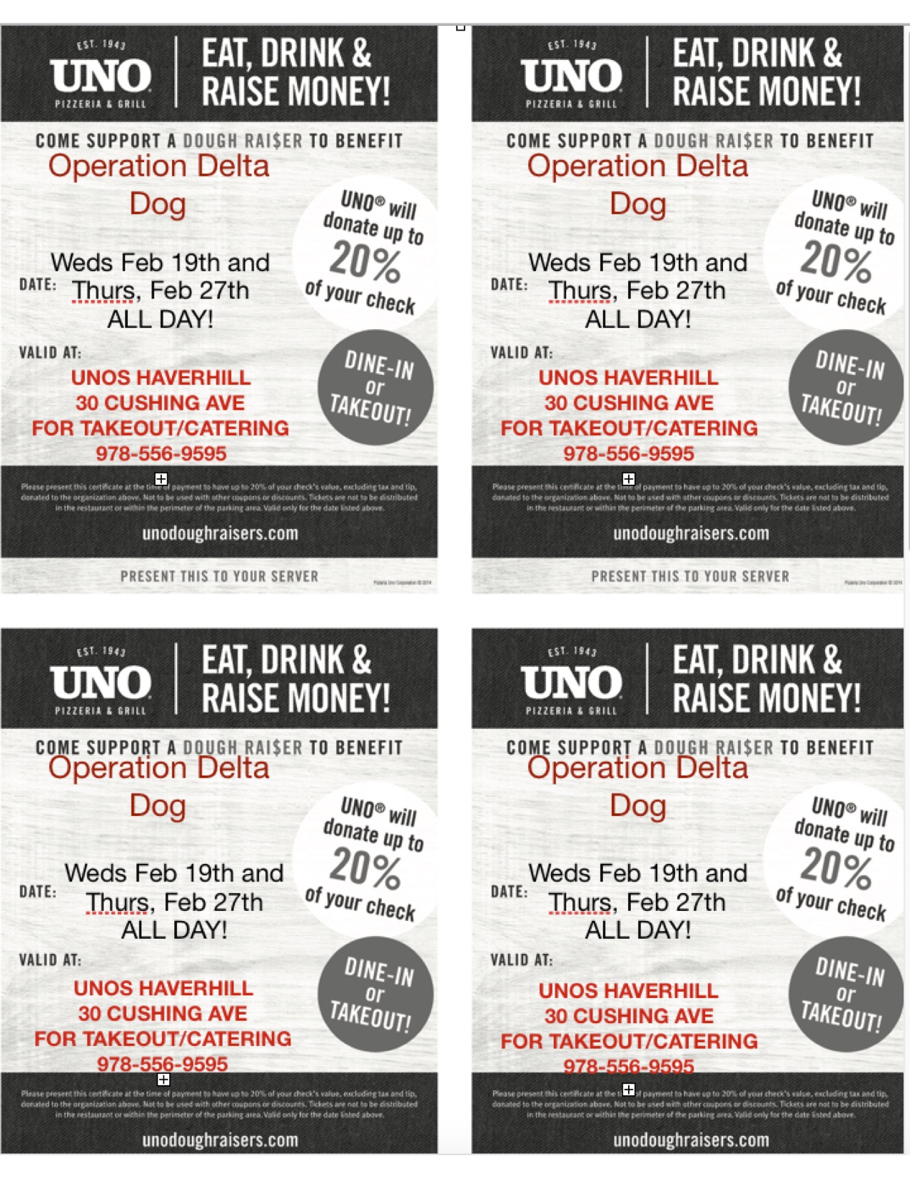 Come help us raise some dough!! Uno’s will donate up to 20% of all sales, this includes dine ins, take outs, catering and BAR!